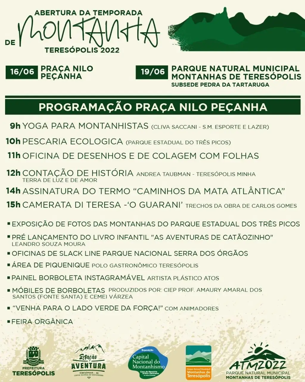 Na programação do dia 16, na Praça Nilo Peçanha, yoga para montanhistas (Cliva Saccani/Secretaria M. de Esporte), pescaria ecológica (equipe do Parque dos Três Picos), oficina de desenhos e de colagem com folhas, contação de história (Andrea Taubman), apresentação da Camerata Di Teresa (‘O Guarani’), exposição de fotos das montanhas do Parque Estadual dos Três Picos, oficinas de slack line e pré-lançamento do livro ‘As Aventuras de Catãozinho’, de Leandro Moura. Haverá área de piquenique e painel borboleta instagramável (artista plástico Atos), móbiles de borboletas (produzidos pelo CIEP Prof. Amaury Amaral dos Santos/Fonte Santa e CMEI da Várzea) e animação com o tema ‘Venha para o lado verde da força!, além de feira orgânica. Na ocasião, acontecerá a assinatura do Termo ‘Caminhos da Mata Atlântica’.