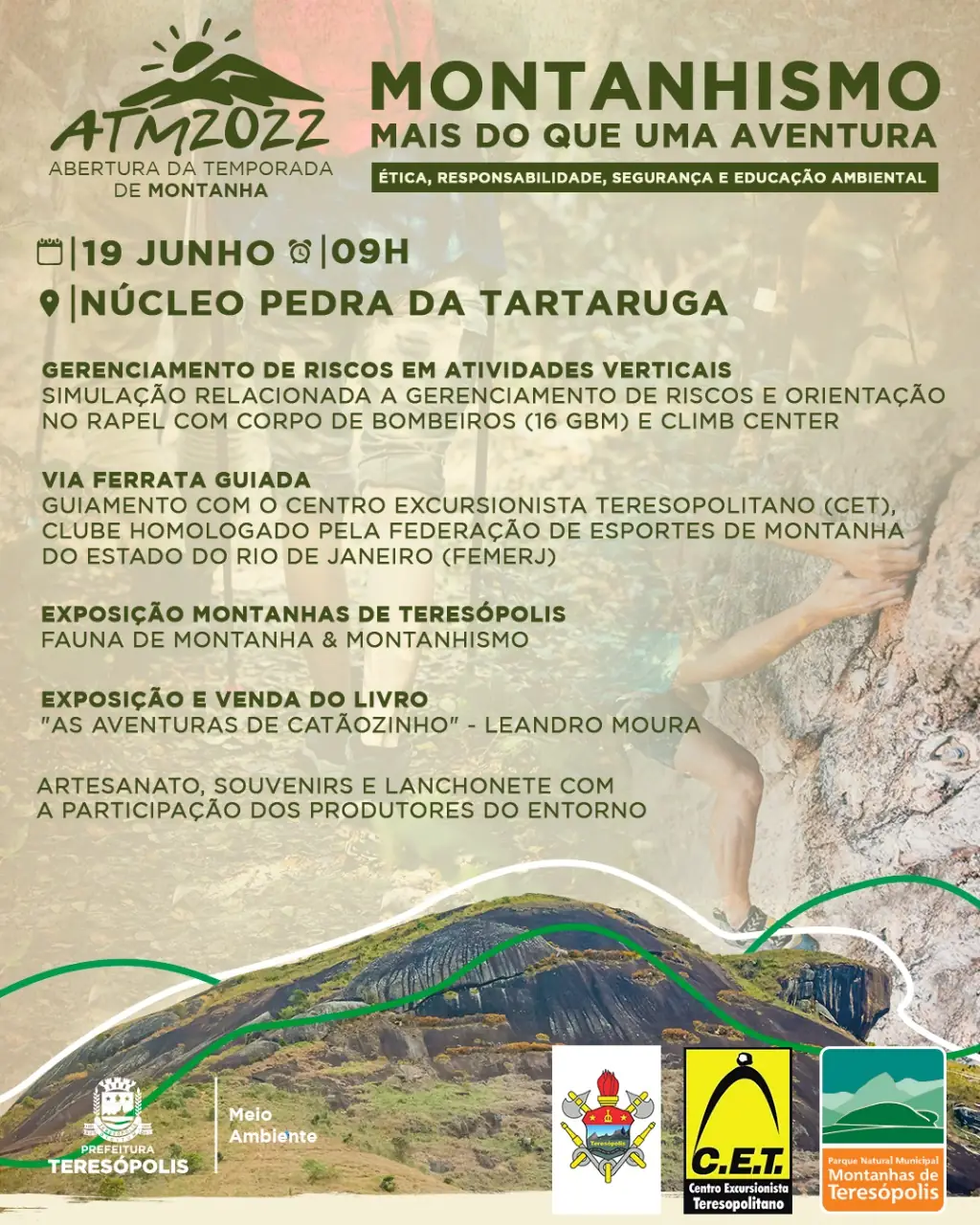 Entre as atividades programadas para o Parque Natural Municipal Montanhas de Teresópolis, no domingo, 19, a partir das 9h, estão Gerenciamento de riscos em atividades verticais, Simulação relacionada a gerenciamento de riscos e orientação no rapel com Corpo de Bombeiros (16 GBM) e Climb Center, Via Ferrata Guiada e Guiamento com o Centro Excursionista Teresopolitano (CET), clube homologado pela Federação de Esportes de Montanha do Estado do Rio de Janeiro (FEMERJ). As atividades orientadas têm vagas limitadas. Para participar é necessário se inscrever para sorteio na página do Parque Municipal no Instagram: pnm.montanhasdeteresopolis. O público também poderá visitar as exposições ‘Montanhas de Teresópolis’ e ‘Fauna de Montanha’ (ao ar livre), além da exposição e venda do livro ‘As Aventuras de Catãozinho’, de Leandro Moura. Artesanato, souvenirs e lanchonete com a participação dos produtores do entorno estão na programação.