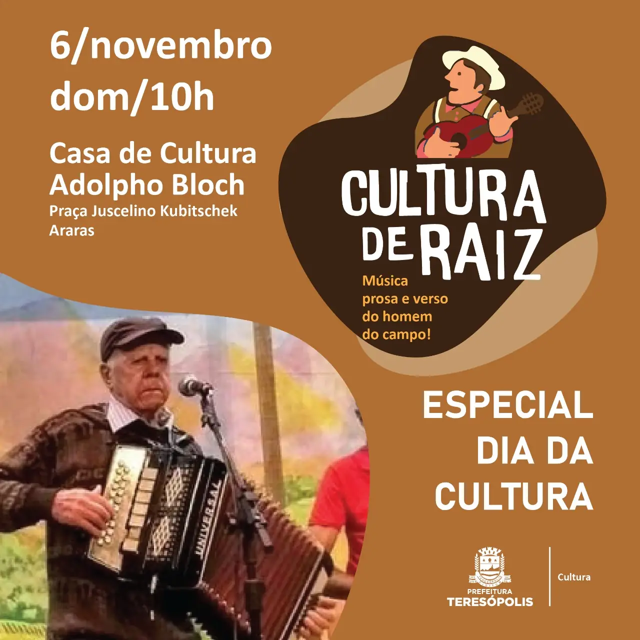 Projetos tradicionais da Secretaria Municipal de Cultura, o Cultura de Raiz e o Música na Matriz têm edição especial no próximo domingo, 06/11, em celebração ao Dia Nacional da Cultura. “Lembrada em 5 de novembro, a data comemora a diversidade das manifestações culturais brasileiras e faz parte do calendário do município, que apresenta um pouco da produção dos nossos artistas e sua arte para nossa gente”, pontua a secretária Cléo Jordão.