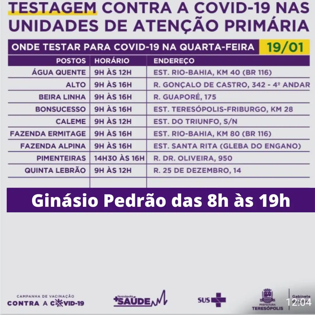 A partir desta quarta-feira (19), o Ginásio Poliesportivo Pedro Jahara (Pedrão), volta a abrigar o Centro de Atendimento contra o Coronavírus de Teresópolis. Desde julho de 2021, a testagem para Covid-19 estava sendo realizada no EPEM, na Várzea. O atendimento continua acontecendo todos os dias da semana, de 8h às 20h.