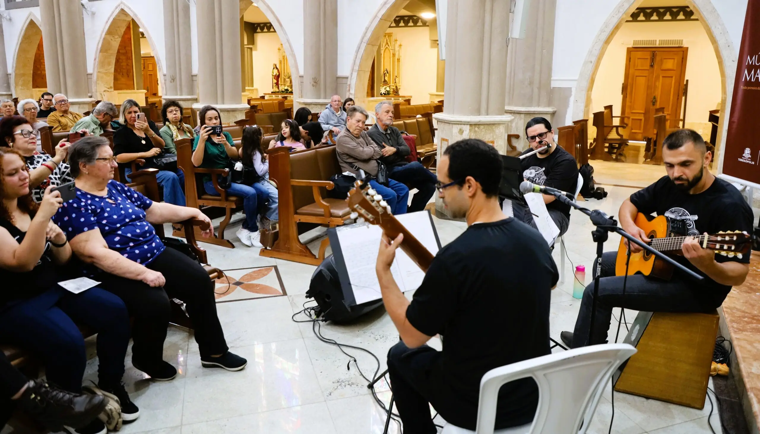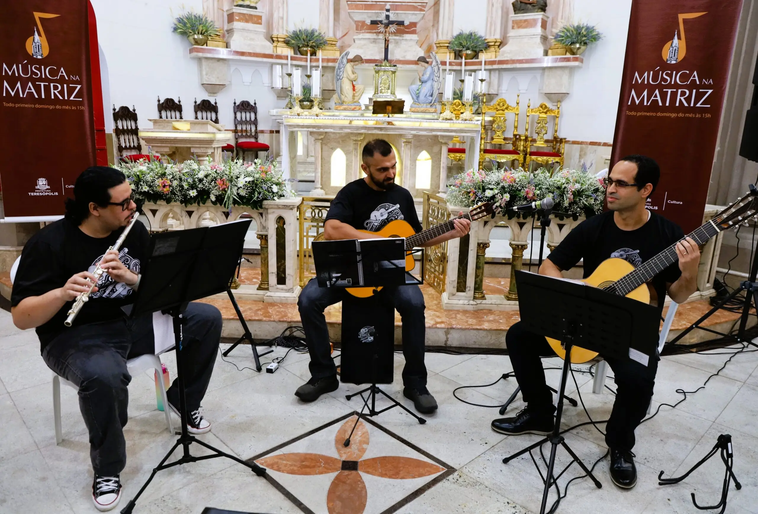 Os acordes do concerto do Trio da Villa tomaram conta da nave da Igreja de Santa Teresa na tarde do domingo no evento Música na Matriz. Dividida em três blocos, a bela e talentosa apresentação dos músicos Allan Kovac (flauta transversa), Márcio Capone (violão 7 cordas) e Vítor Medeiros (violão 6 cordas e percussão) brindaram o público com obras de Tom Jobim e Vinicius de Moraes, Adoniram Barbosa, Cartola, Pixinguinha, João Pernambuco, Baden Powell, Luiz Gonzaga e Jorge Aragão. Resultado: calorosos aplausos do público aos músicos, que são alunos da Escola Municipal de Música Giordano Marrelli – Polo da Escola de Música Villa-Lobos em Teresópolis.