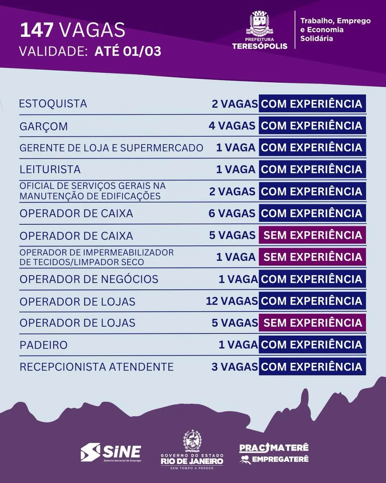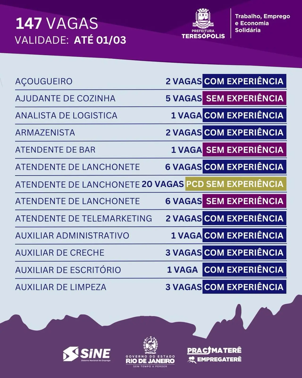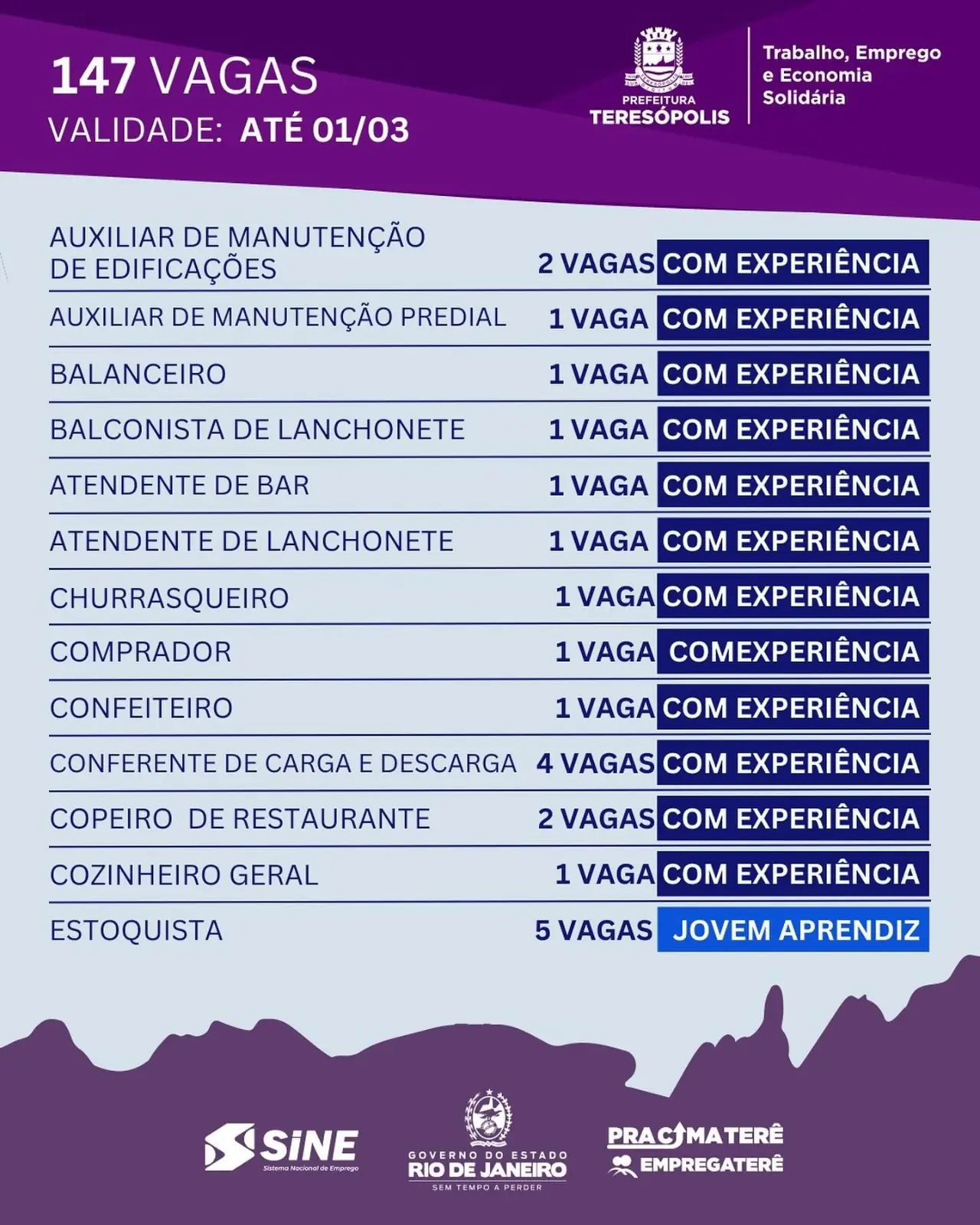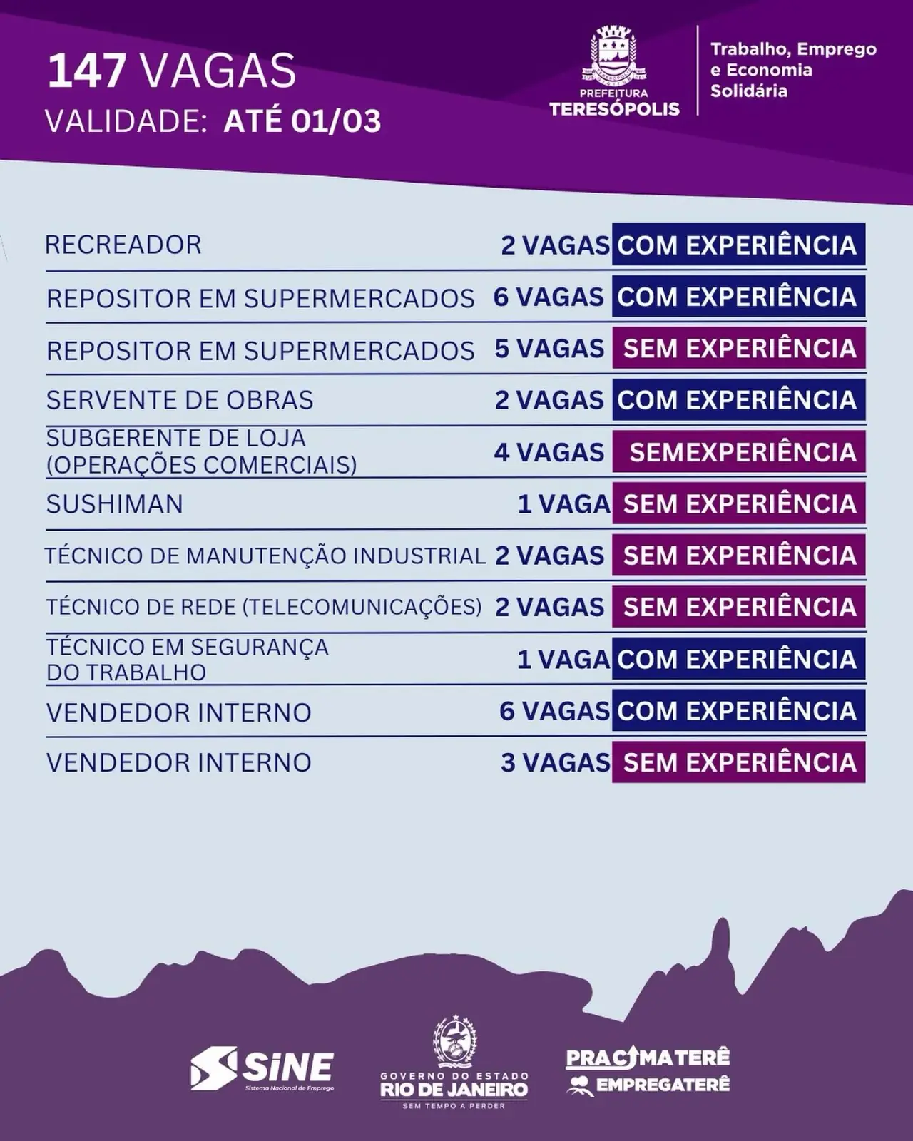 Até o dias 1º de março o SINE Teresópolis disponibiliza 147 oportunidades de emprego. Para pessoas com experiência há vagas para açougueiro, auxiliar de escritório, churrasqueiro, confeiteiro, estoquista, leiturista, padeiro, recreador e servente de obras, entre outras. Para candidatos sem experiência, há oportunidades para ajudante de cozinha, atendente de bar, operador de caixa, repositor em supermercado, técnico de rede e vendedor interno.