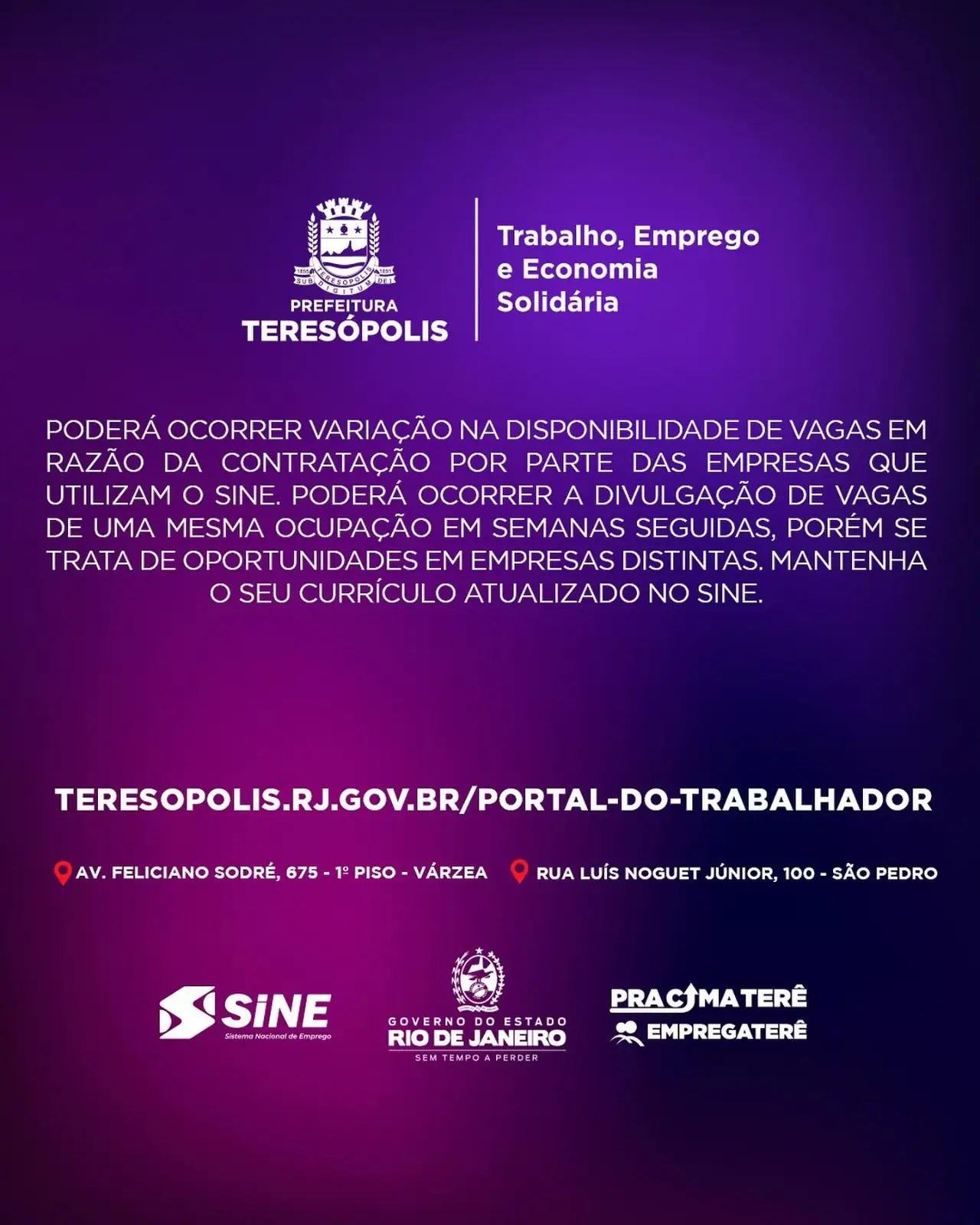 Atendimento: O atendimento presencial e por ordem de chegada acontece de segunda a sexta, das 9h às 17h no SINE, no 1º piso da Prefeitura (Av. Feliciano Sodré, 675, Várzea) e na Casa do Trabalhador (Rua Luiz Noguet Jr, 100, São Pedro).