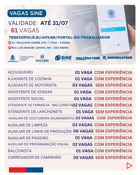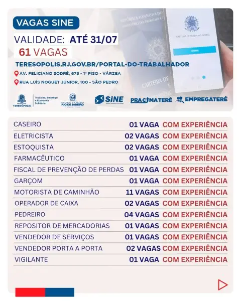 Atendimento: O atendimento presencial acontece de segunda a sexta, de 9h às 17h, no SINE Teresópolis, no 1º piso da Prefeitura (Av. Feliciano Sodré, 675), na Várzea, e na Casa do Trabalhador (Rua Luiz Noguet Jr, 100), no bairro de São Pedro.