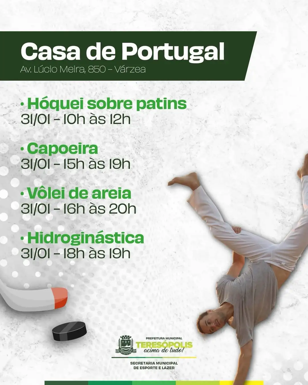 - Viradão 24h em Movimento: Começa no sábado, 31/01, e segue até domingo, 01/02, o Teresópolis Ativa – Viradão 24h em Movimento. O evento vai agitar a cidade com 24 horas de atividades físicas e esportivas gratuitas para todos os públicos, incluindo PcDs.São 10 locais, cada um com uma programação e horário: Praça Olímpica, Ginásio Pedrão,Reta, Teresópolis Golf Club, Casa de Portugal, Casa Espanhola, Praça Samuel de Paula Macário (Bonsucesso, no interior), HTT Pong Center, Gaia Terramar e Academia Dolphin. Não é necessária inscrição prévia, basta comparecer ao local da atividade desejada na hora programada.