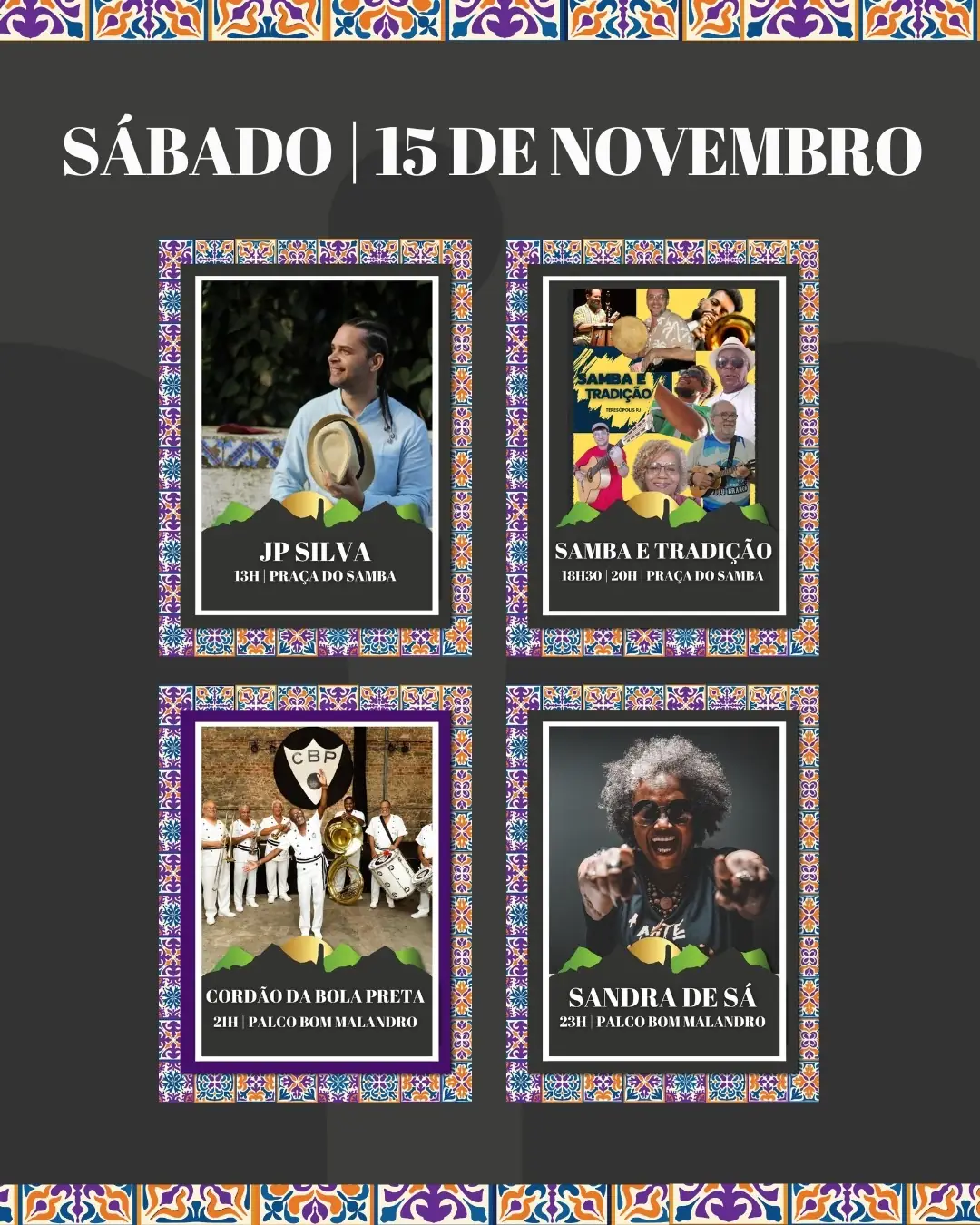 ♪ No sábado, 15/11, é a vez do JP Silva (13h) e Samba e Tradição (18h30) na Praça do Samba, com oficina de dança e atividades de sinuca (17h). No Palco Bom Malandro (área paga), show com o Cordão da Bola Preta (21h) e Sandra de Sá (23h).