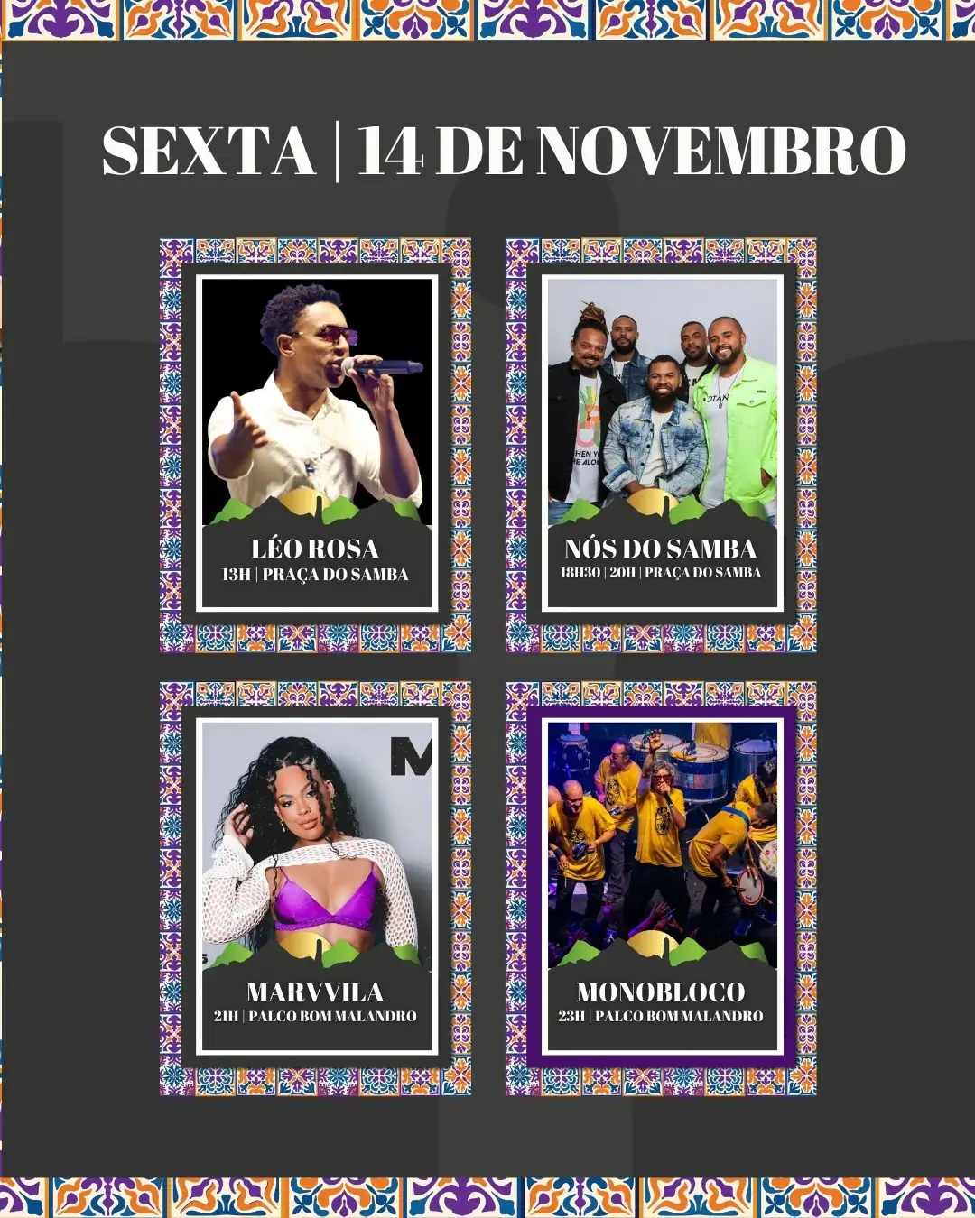 ♪ Na sexta, 14/11, a Praça do Samba apresenta Léo Rosa (13h) e Nós do Samba (18h30), oficina de dança (17h) e atividades de sinuca (18h30). O Palco Bom Malandro (área paga) recebe Marvvila (21h) e Monobloco (23h).