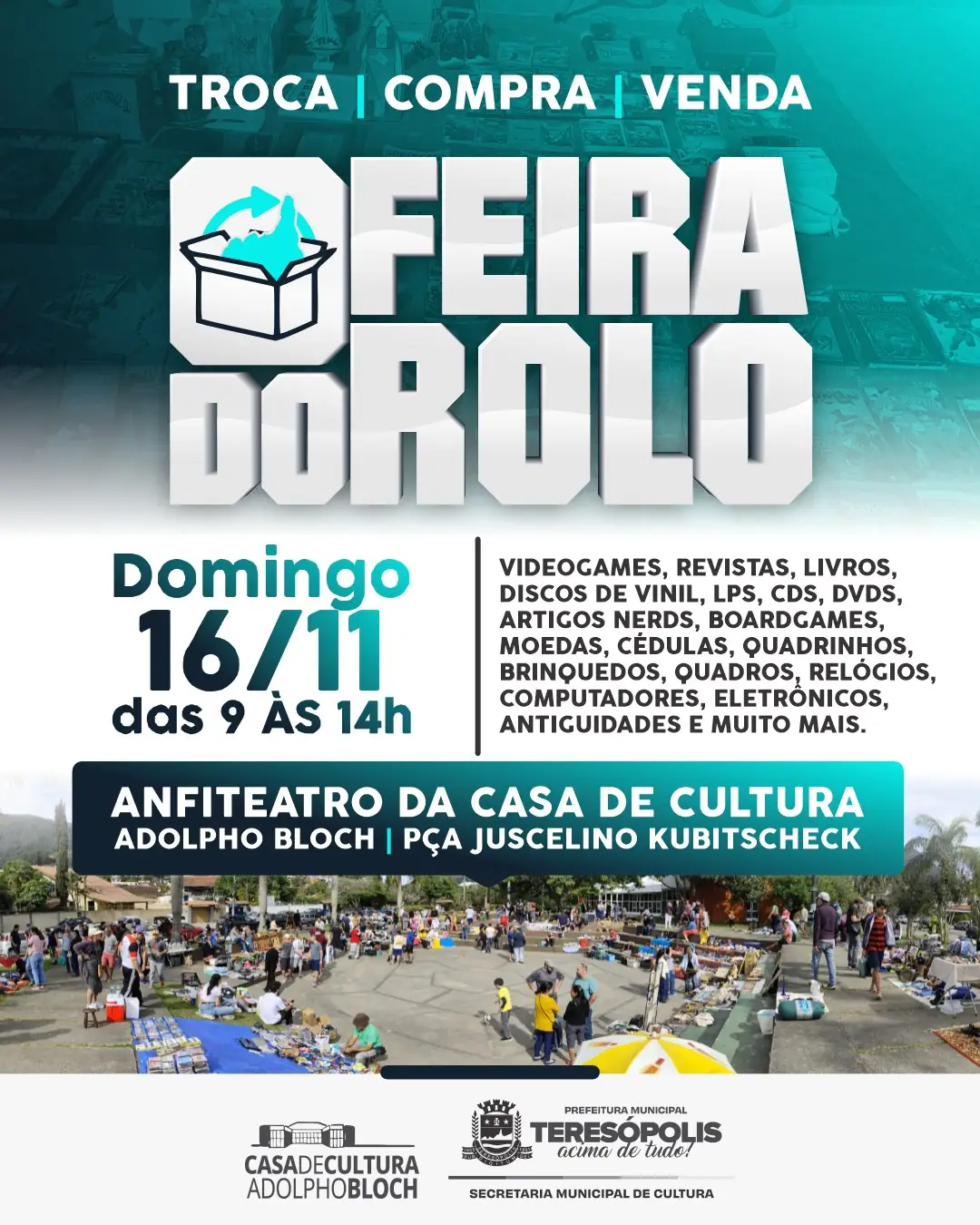 • Feira do Rolo: Espaço democrático para troca, compra e venda, a Feira do Rolo realiza mais uma edição neste domingo, 16 de novembro, das 9h às 14h, no anfiteatro da Casa de Cultura Adolpho Bloch (Praça Juscelino Kubistchek, bairro de Fátima). Os interessados podem levar qualquer artigo para negociar da forma que quiserem: peças de artesanato, colecionáveis ou antiguidade, eletrônicos, ferramentas e utilidades em geral. Basta estar atento, pois toda negociação feita no local é por conta e risco dos interessados. Apoio da Secretaria Municipal de Cultura.
