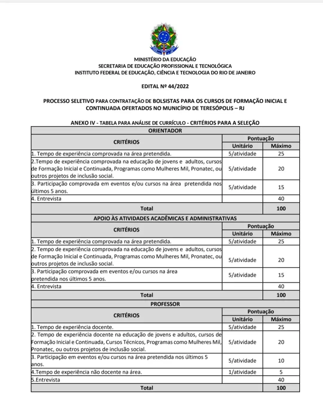 Pelo Edital 44/2022, são oferecidas 17 vagas para selecionar candidatos para atuar como instrutores nos quatro cursos de Formação Inicial e Continuada oferecidos em parceria com a Prefeitura de Teresópolis: Balconista de Farmácia, Assistente Administrativo, Assistente em Logística e de Microempreendedor Individual.