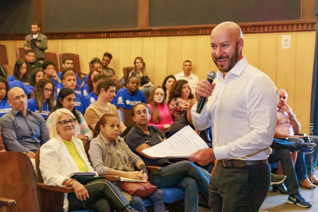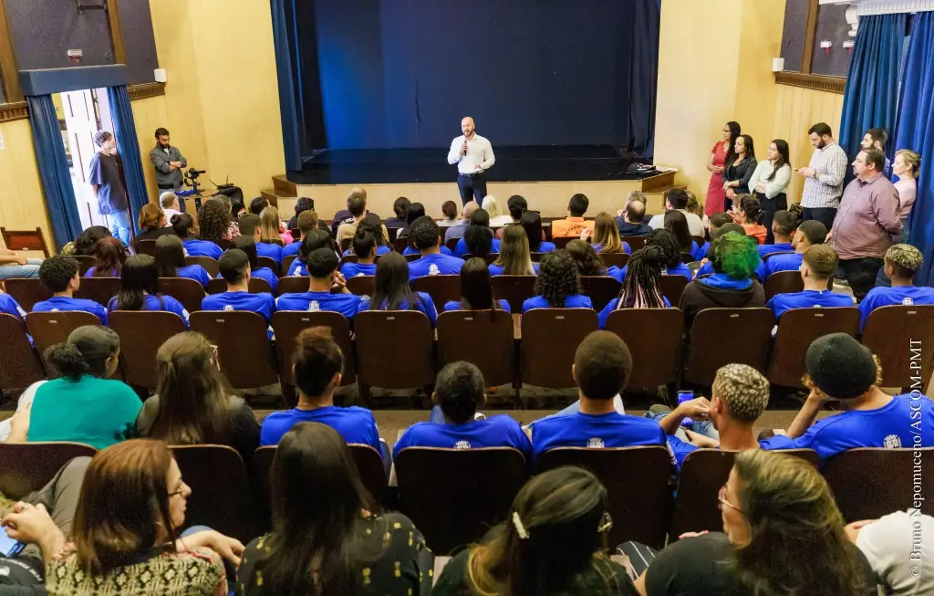 Os 45 jovens selecionados para atuar no eixo ‘Gestão Pública’, dentro do Novo Promaj – Programa de Atendimento ao Jovem – começam o trabalho nas secretarias municipais nesta segunda-feira, 8. Em encontro promovido no Teatro Municipal, na Prefeitura, na última sexta-feira, 5, o Prefeito Vinicius Claussen deu as boas-vindas aos selecionados para o programa social de inserção no mercado de trabalho e capacitação profissional, lançado pela gestão municipal em junho deste ano. Secretários municipais e supervisores, servidores que irão orientar os jovens sobre o trabalho a ser executado, também participaram da reunião.