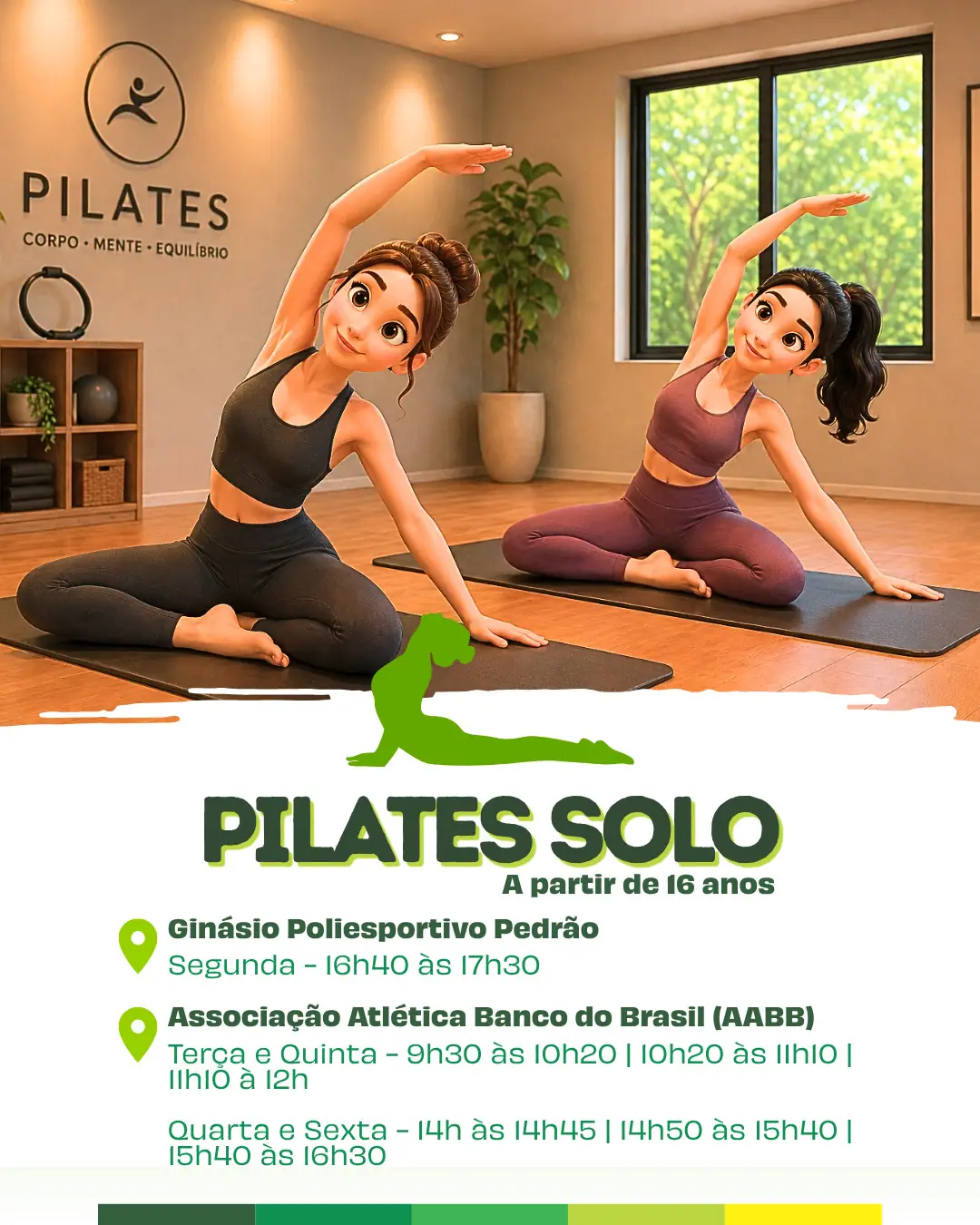 Entre as modalidades oferecidas está o Pilates Solo, para jovens a partir de 16 anos, com aulas realizadas na Associação Atlética Banco do Brasil (AABB). As turmas acontecem às terças e quintas-feiras, nos horários de 9h30 às 10h20, 10h20 às 11h10 e 11h10 às 12h. Já às quartas e sextas-feiras, as aulas são realizadas das 14h às 14h45, 14h45 às 15h40 e 15h40 às 16h30. No Ginásio Poliesportivo Pedrão, há turma às segundas-feiras, das 16h40 às 17h30.