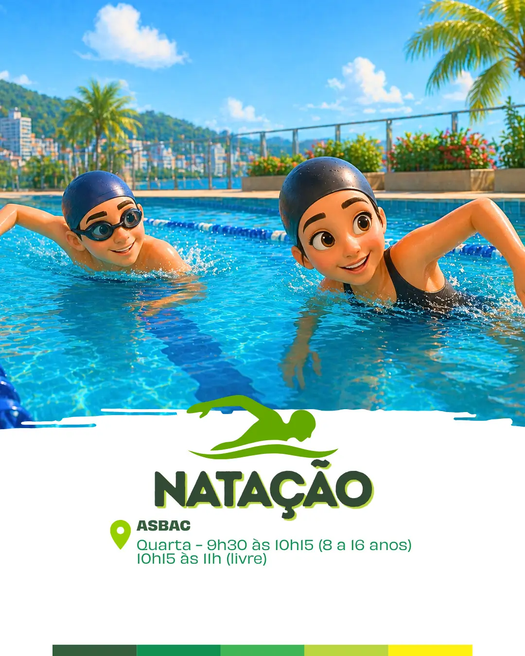 A programação inclui ainda aulas de natação na ASBAC, às quartas-feiras. As turmas são divididas por faixa etária: das 9h30 às 10h15 para jovens de 8 a 16 anos, e das 10h15 às 11h para o público em geral.