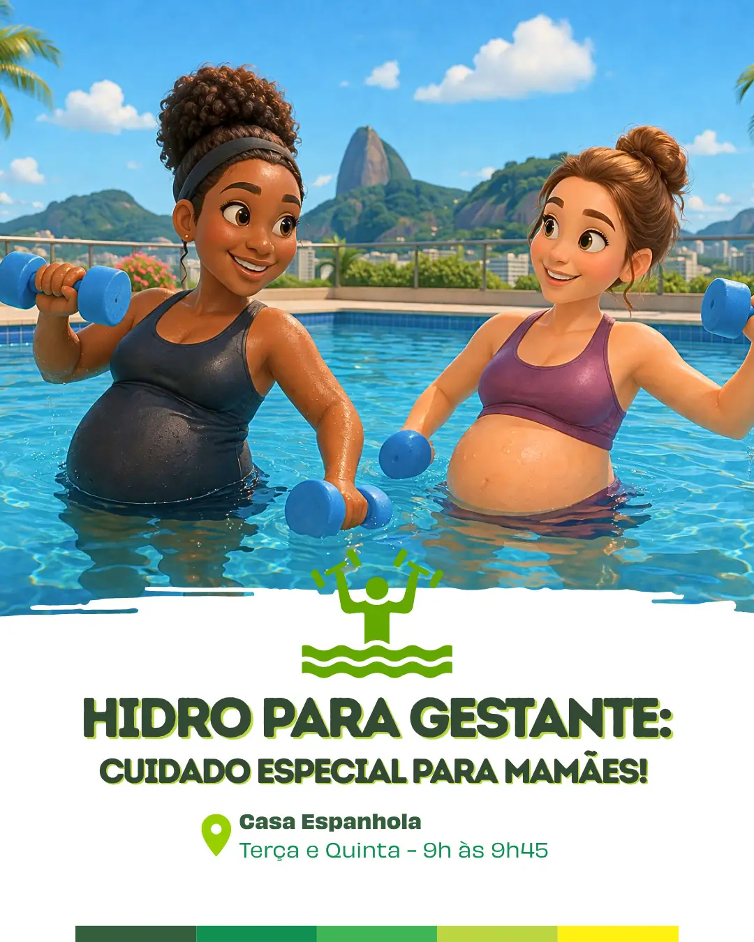 Para gestantes, a SMEL oferece aulas de hidroginástica na Casa Espanhola, às terças e quintas-feiras, das 9h às 9h45, proporcionando um cuidado especial durante a gestação.
