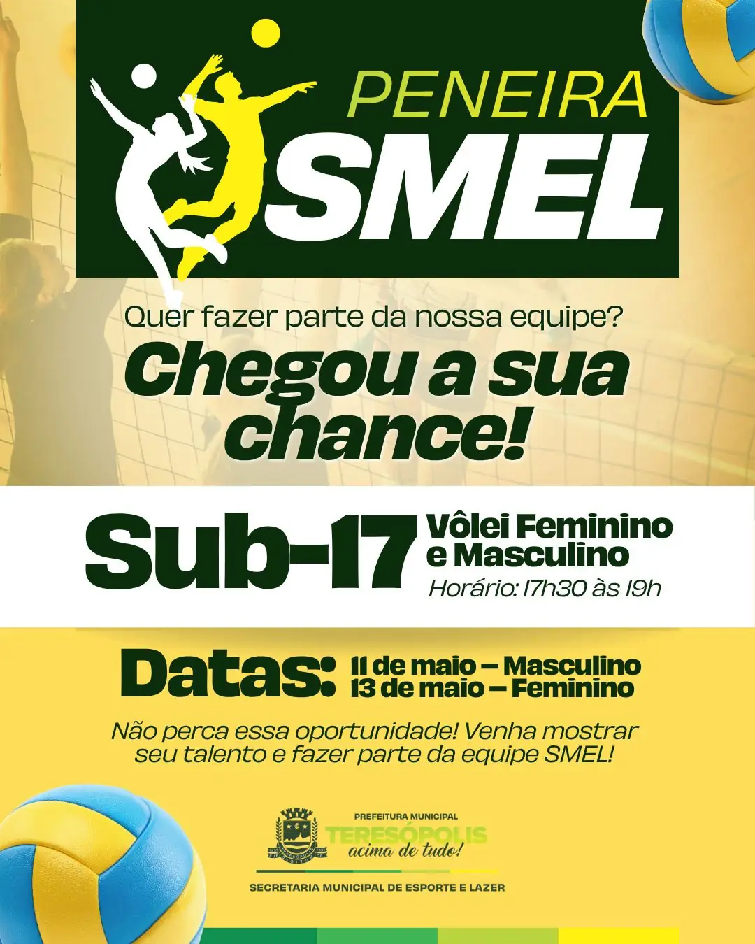 Além das aulas regulares, a Secretaria também promove ações especiais. Nos dias 11 e 13 de maio, será realizada a peneira para a equipe SMEL de vôlei Sub-17, nas categorias masculina e feminina, respectivamente. As seletivas acontecem das 17h30 às 19h e são voltadas a jovens interessados em integrar as equipes do município.