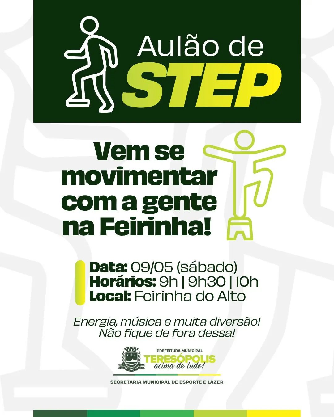 Já no dia 9 de maio, a equipe SMEL promove um aulão de step na Feirinha do Alto, com três horários disponíveis: 9h, 9h30 e 10h. A atividade é aberta ao público e promete reunir música, energia e muita movimentação.
