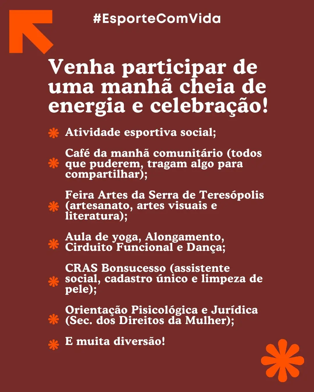 Durante a manhã, as participantes poderão aproveitar uma programação variada, com atividades esportivas e sociais, café da manhã comunitário (todos que puderem, tragam algo para compartilhar), a Feira Artes da Serra de Teresópolis (artesanato, artes visuais e literatura), aula de alongamento, yoga, circuito funcional, dança e muita diversão.