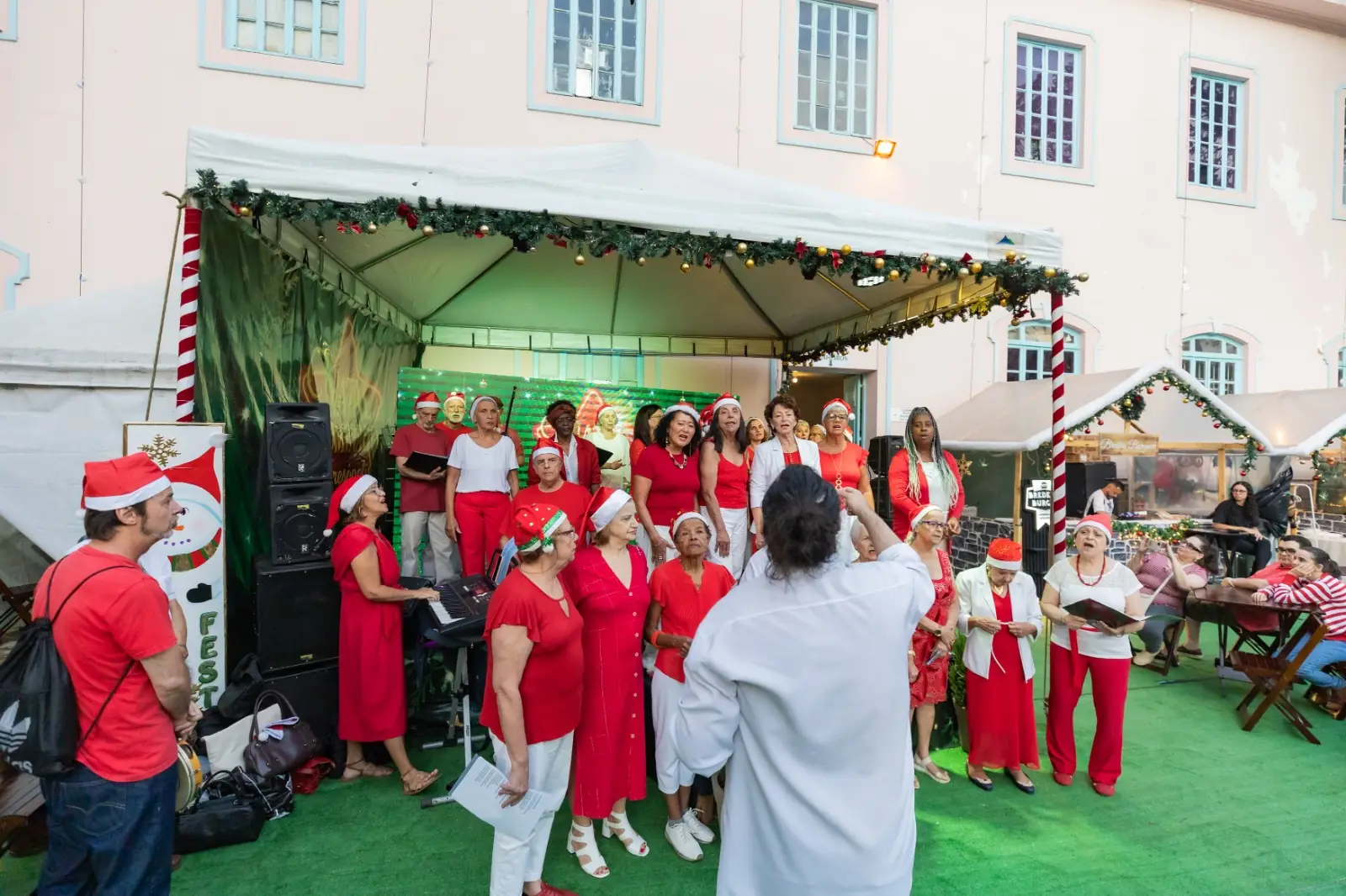 “Oi, pessoal de Teresópolis! Nós somos o Coral 50+ da Feso Pro Arte e estamos aqui para cantar para vocês lindas músicas de Natal. Preparamos um repertório cheio de canções tradicionais para deixar a noite ainda mais especial. Esperamos todos vocês na Vila do Papai Noel!E aproveitem, hoje também tem o passeio do trenzinho Venham, vai ser mágico!”, destacou Jane Cristina, maestrina do Coral 50+ Feso Pro Arte.