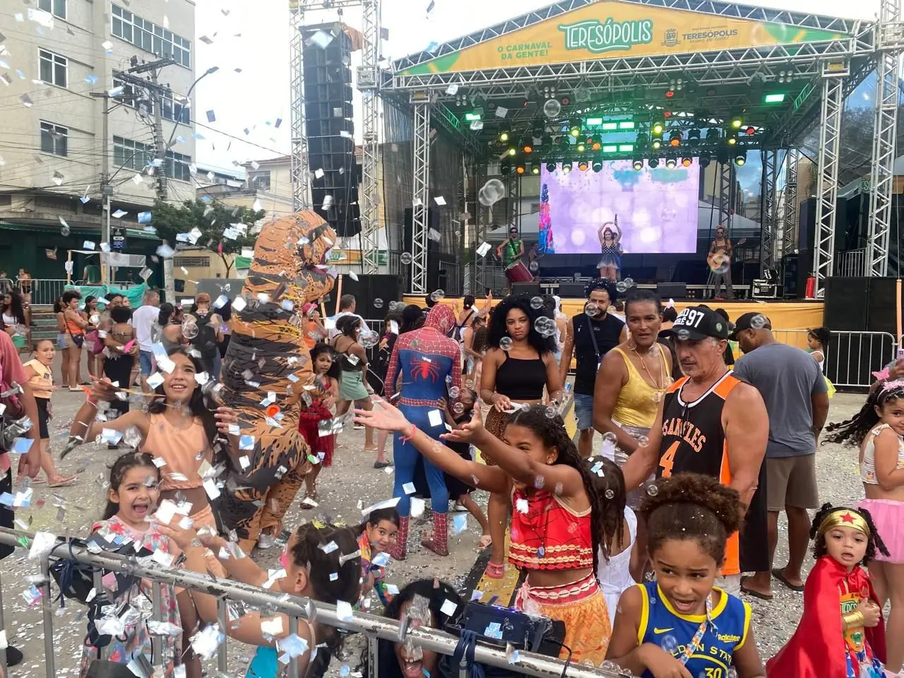 Adultos e crianças aproveitaram o domingo ensolarado para se divertir com a programação do Carnaval em Teresópolis. Na Feirarte, a popular Feirinha de Teresópolis, no Alto, o esquenta começou com o DJ Jonathan Marques. Depois, a garotada curtiu o Bailinho do Bem, com Luiz Carlos Turl e Banda, em meio a confete, serpentina e muita energia.