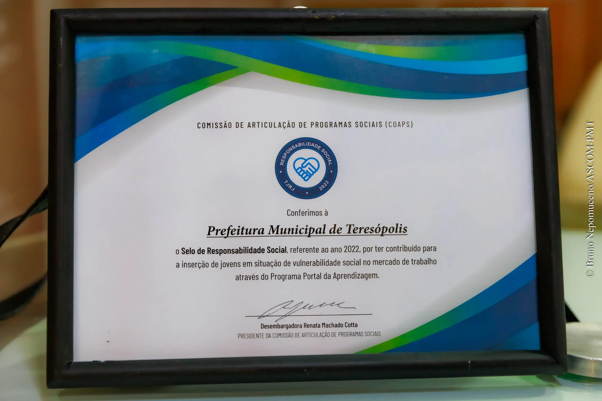 A Prefeitura de Teresópolis recebeu, na quarta-feira (7), o Selo de Responsabilidade Social do Tribunal de Justiça do Estado do Rio de Janeiro (TJRJ), pela contribuição na Comissão de Articulação de Programas Sociais (COAPS). A homenagem foi entregue pela desembargadora Renata Machado Cotta ao Secretário Municipal de Trabalho, Emprego e Economia Solidária e à Subsecretária de Desenvolvimento Social, Iracema Toledo, que representaram o Prefeito Vinicius Claussen na solenidade no Salão dos Magistrados do Fórum Central do TJRJ.