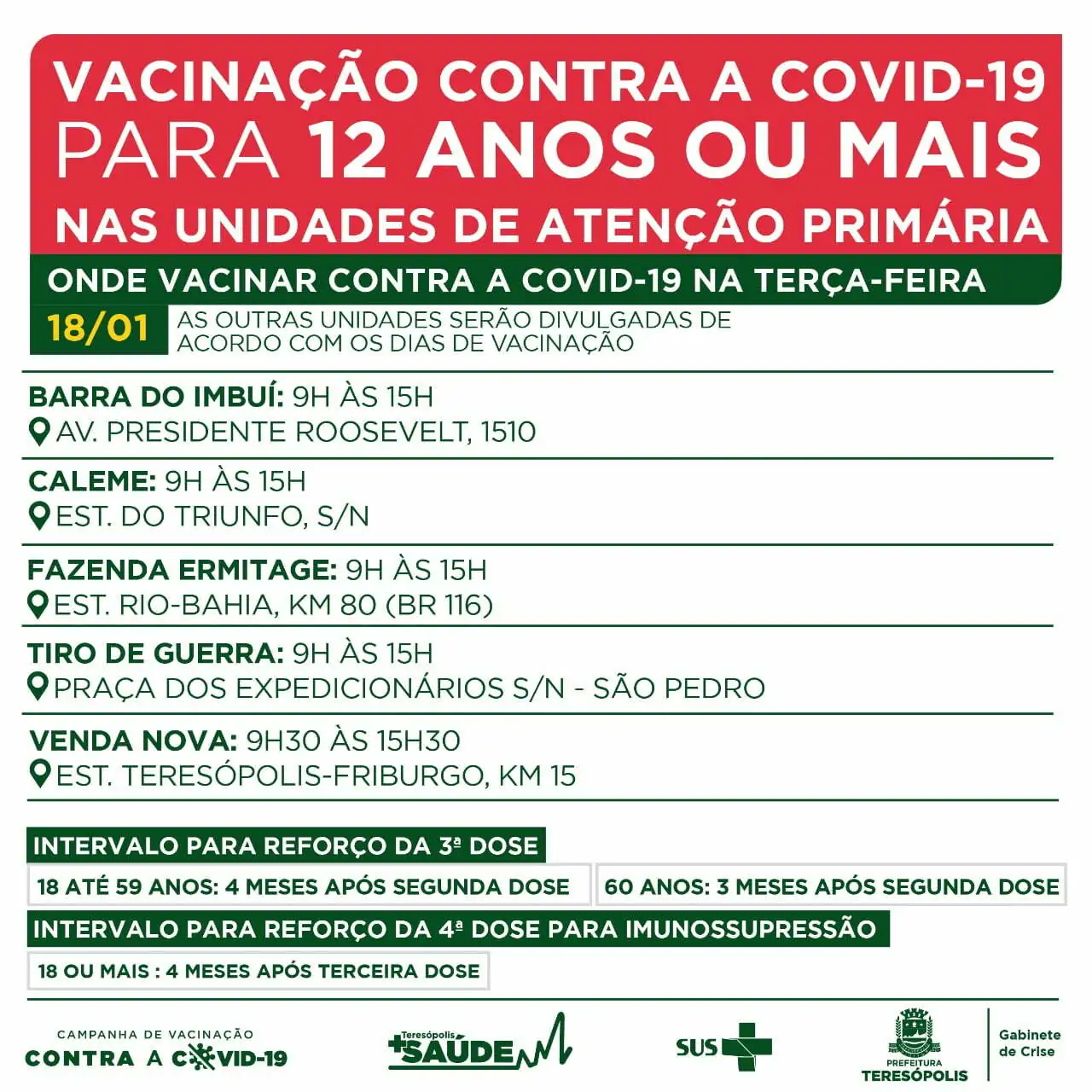Nesta terça-feira (18), a Prefeitura Municipal de Teresópolis, por meio da Secretaria Municipal de Saúde, aplicará a primeira dose do imunizante contra a Covid-19 em crianças de 11 a 5 anos de idade, com comorbidade ou deficiência permanente. A vacinação ocorre em unidades de saúde de acordo com cronograma de cada local.