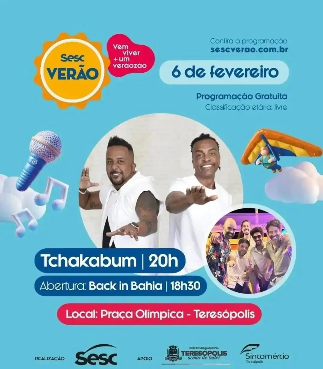 • Shows de Tchakabum e Buchecha: Atrações do SESC Verão 2026, Tchakabum se apresenta em Teresópolis nesta sexta, 6, e Buchecha no sábado, dia 7, às 20h. O local é a Praça Olímpica Luís de Camões, no centro da cidade. Na sexta, abre o show a banda Back In Bahia e no sábado, O Baile é Todo Nosso, a partir das 18h30. Com o slogan “Vem viver + um verãozão”, o evento tem o apoio da Secretaria Municipal de Turismo.