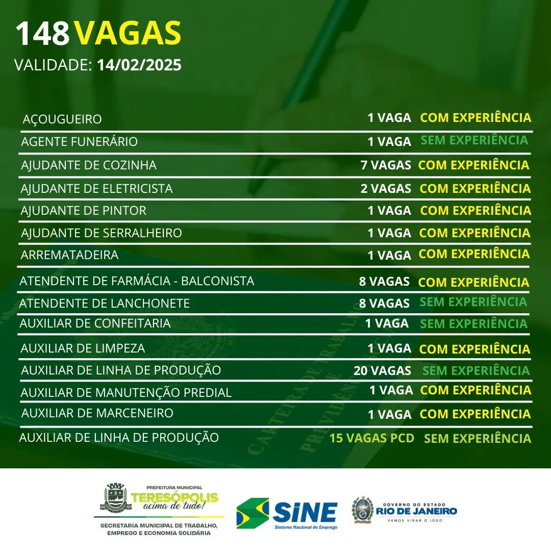 O Sine Teresópolis tem 148 oportunidades de emprego disponíveis até o dia 14 de fevereiro. Há vagas para trabalhadores com e sem experiência e também para pessoas com deficiência (PcD).