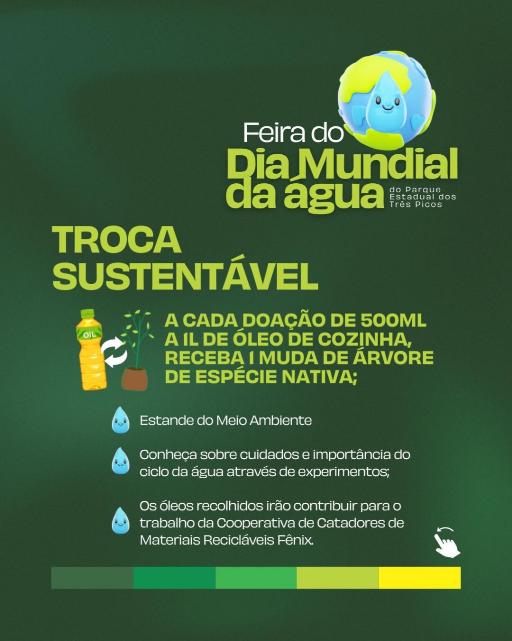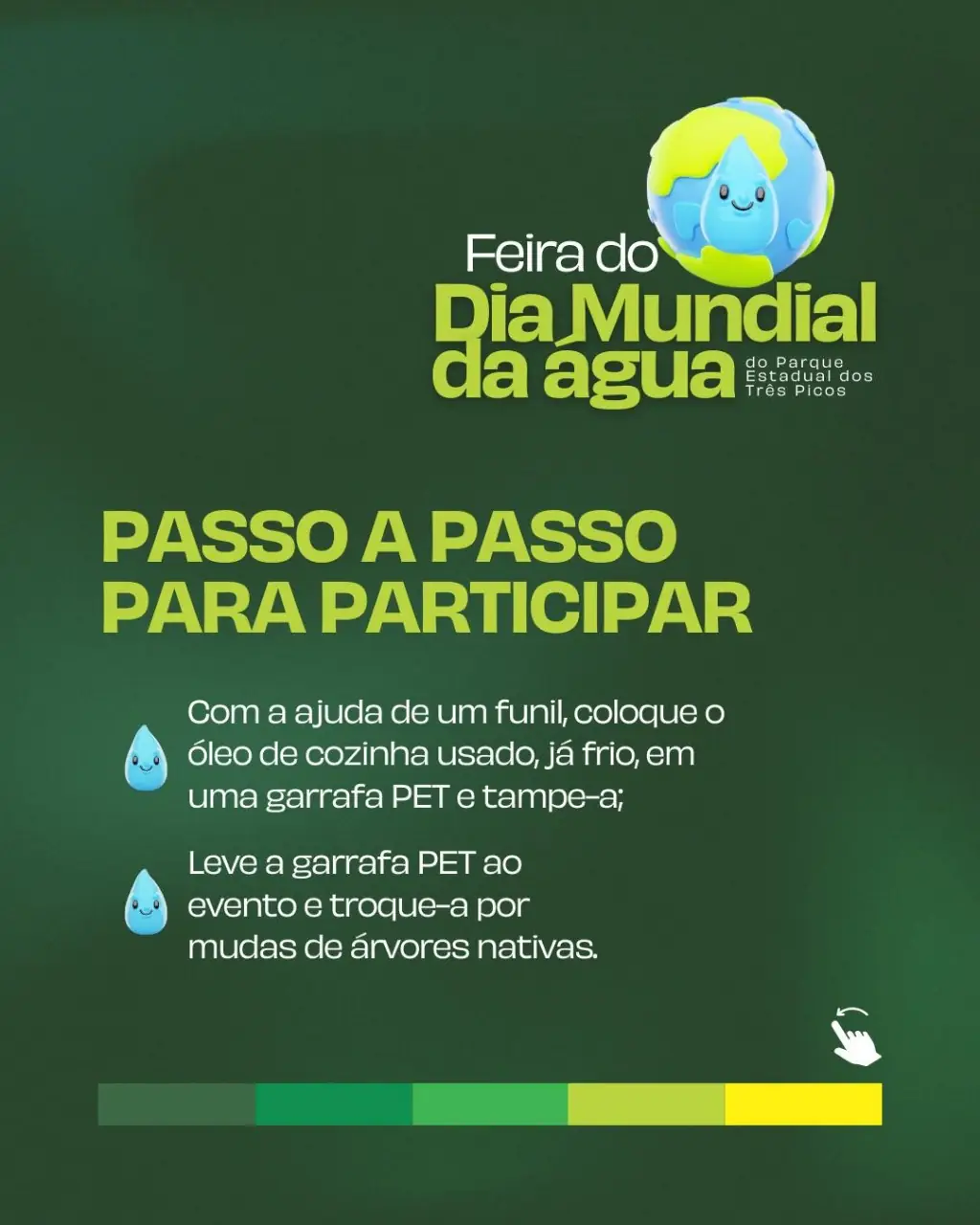 Durante a ação, as equipes estarão subsede Vale da Revolta em uma tenda para realizar a troca de mudas de árvores nativas por 500ml a 1L de óleo de cozinha. Para participar, siga o passo a passo abaixo. Convidamos todos a se juntarem a nós e a fazer parte dessa troca sustentável.