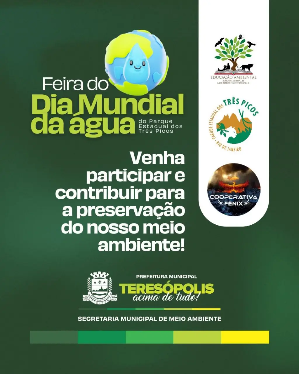 A Prefeitura Municipal de Teresópolis, por meio da Secretaria Municipal de Meio Ambiente/Educação Ambiental, em parceria com o Parque Natural Municipal Montanhas de Teresópolis, estará presente na Feira em comemoração ao Dia Mundial da Água. O evento, promovido pelo Parque Estadual do Três Picos, acontecerá no próximo sábado, dia 22, das 9h às 13h, na subsede Vale da Revolta (Rodoviária BR-116, Km 88, no Vale da Revolta).