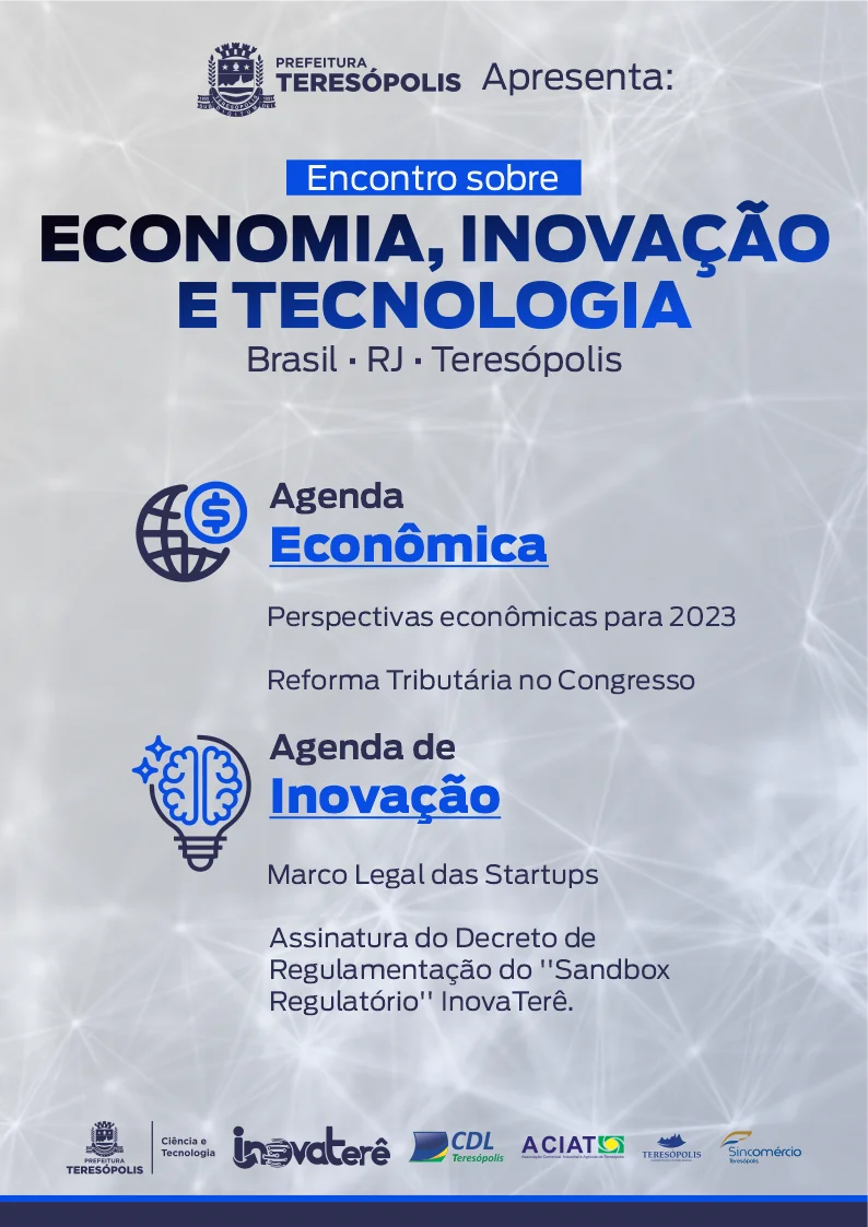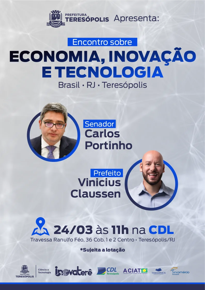 A Prefeitura de Teresópolis, por meio da Secretaria Municipal de Ciência e Tecnologia, promove, nesta sexta-feira, 24/03, às 11h, na CDL (Câmara de Dirigentes Lojistas) o Encontro sobre Economia, Inovação e Tecnologia. O evento contará com a participação do senador Carlos Portinho e do Prefeito Vinicius Claussen.