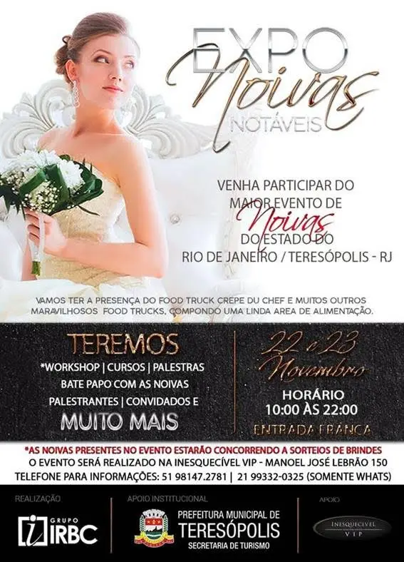 Com realização do Grupo IRBC e apoio institucional da Prefeitura, através da Secretaria Municipal de Turismo, acontece nestas quarta, 22, e quinta, 23 de novembro, o Expo Noivas Notáveis, considerado o maior evento de noivas do Estado do Rio de Janeiro. É mais um evento incluído no calendário do município, com o objetivo de atrair visitantes e movimentar a cidade.