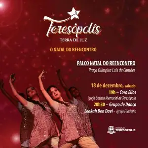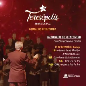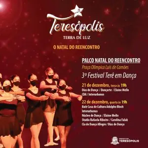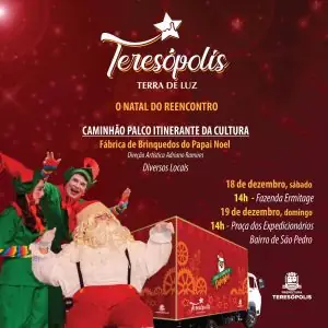 Com o tema ‘O Natal do Reencontro’, a programação do projeto Teresópolis Terra de Luz –Natal 2021 segue, nos próximos dias no município. A peça teatral ‘Fábrica de Brinquedos do Papai Noel’, no Caminhão Palco Itinerante da Cultura, será encenada, no sábado, 18, na Fazenda Ermitage, e no domingo, 19, na Praça do Tiro de Guerra, em São Pedro. Na Praça Olímpica, no centro, o público poderá assistir concertos natalinos e apresentações do 3º Festival Terê em Dança.